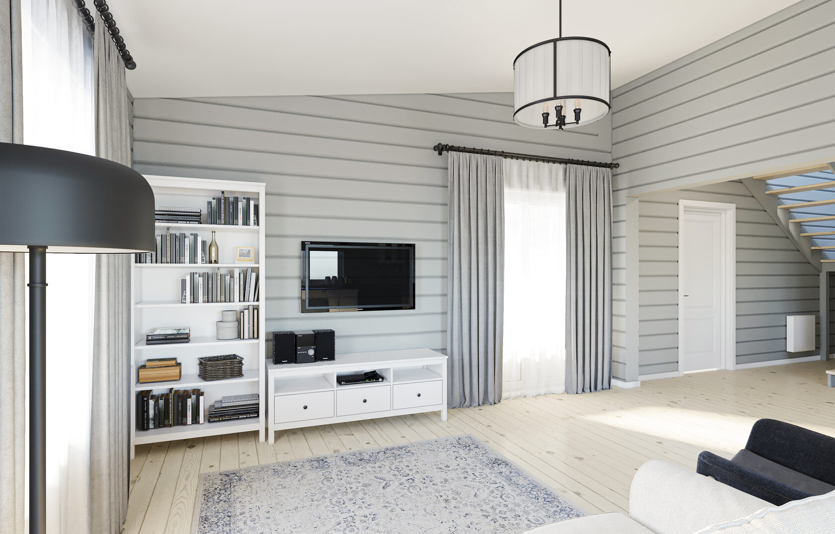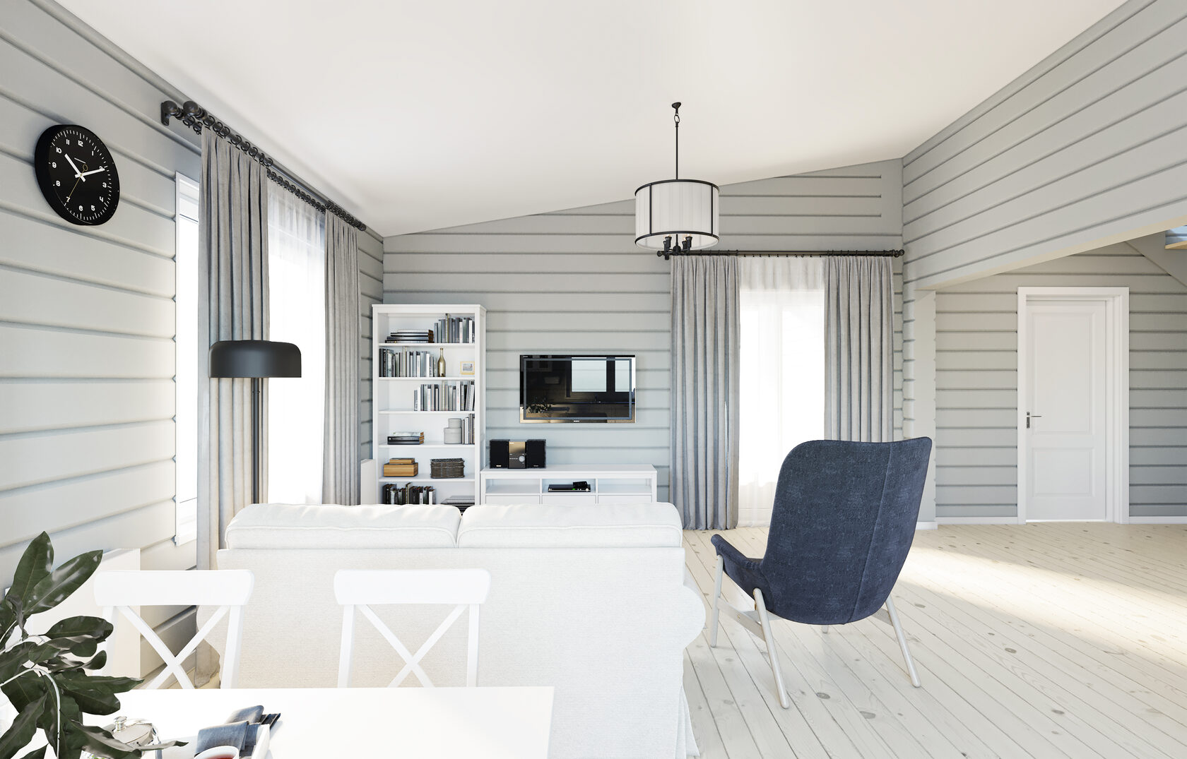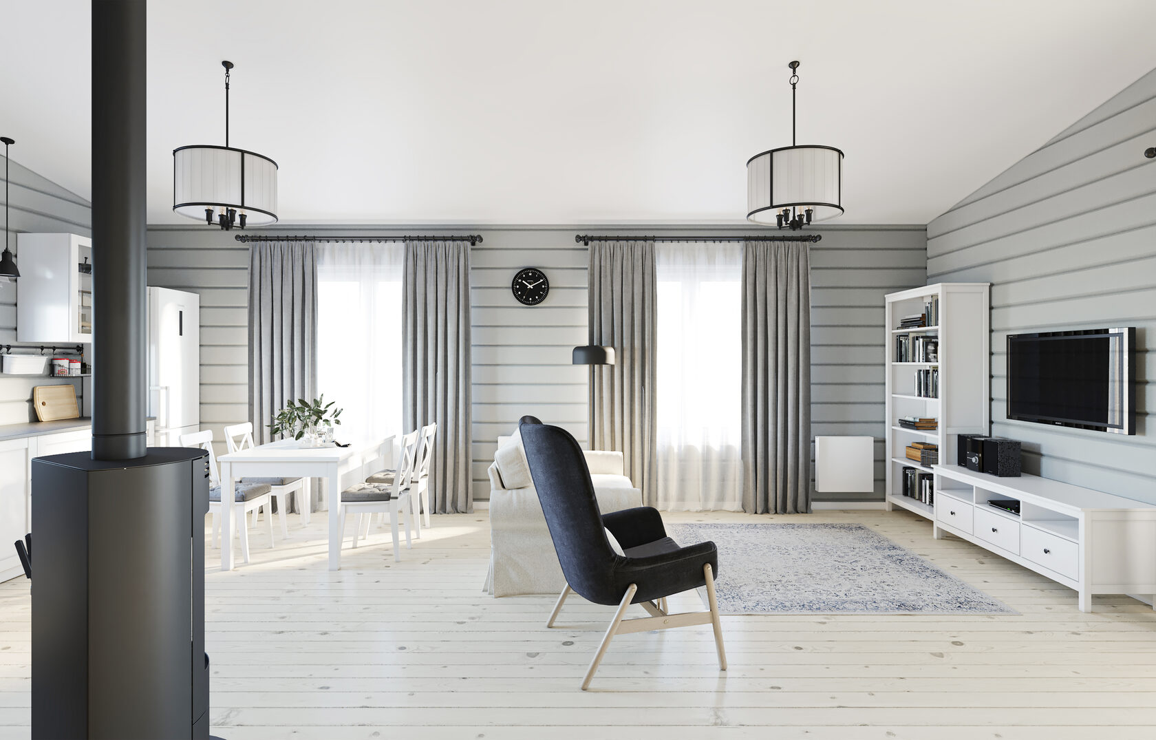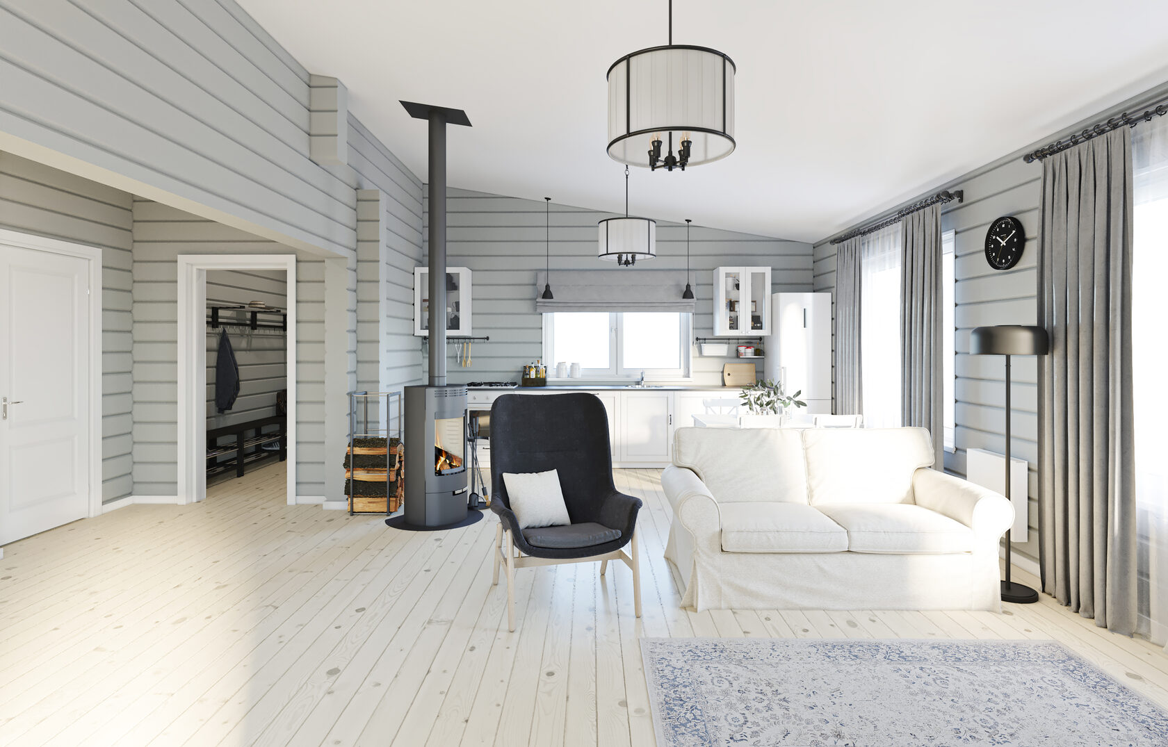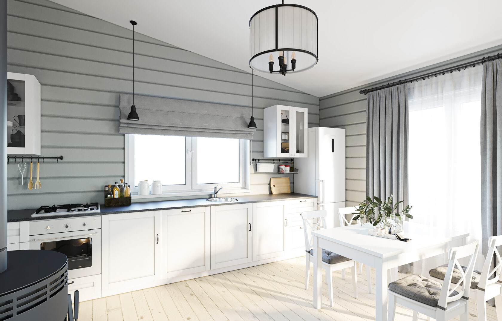 Сердце дома это конечно же кухня-гостиная, тут минимум стен, много воздуха и простора, что делает ее очень воздушной, но при этом уютной. Сюда можно попасть как через главный вход, так и с заднего двора, через террасу, кстати именно с этой террасы открывается тот самый вид на реку, и по этому двери мы сделали тоже с остеклением.
