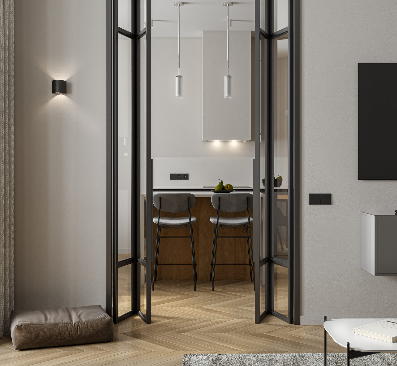 Кухню мы объединили с просторной гостиной стеклянными дверьми перегородками, которые выполняют свою функцию, не загромождая пространства, а даже наоборот подчеркивая его объем и простор.