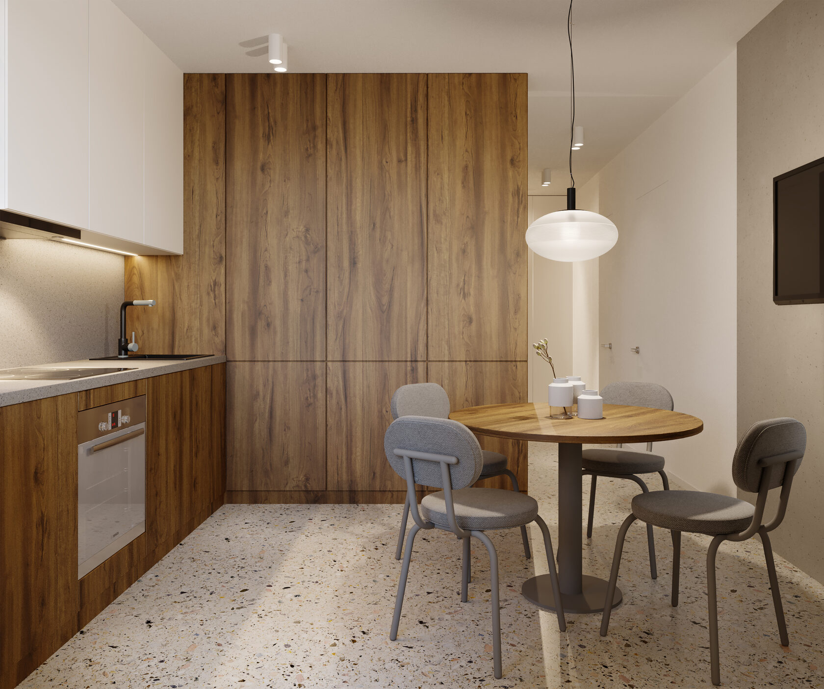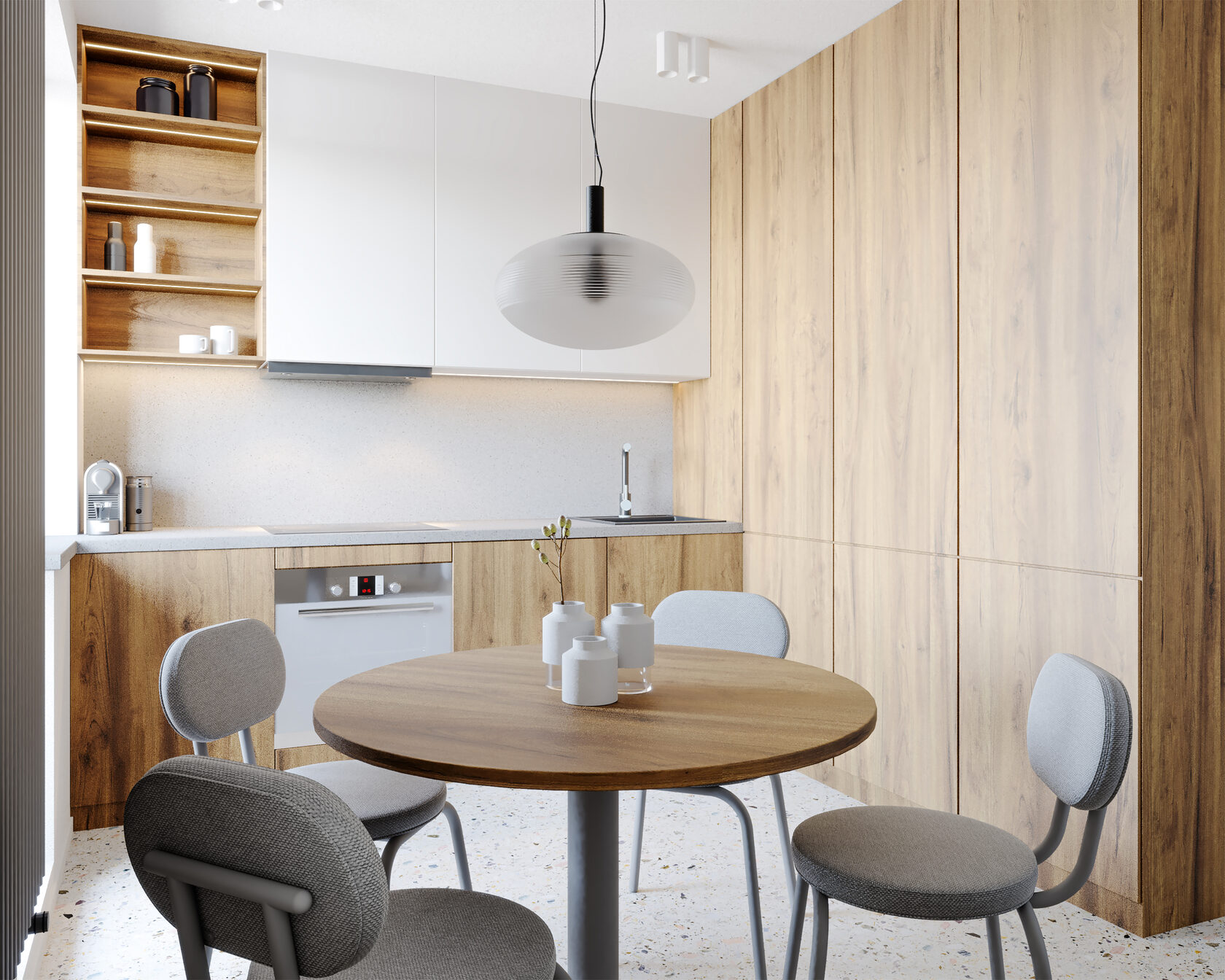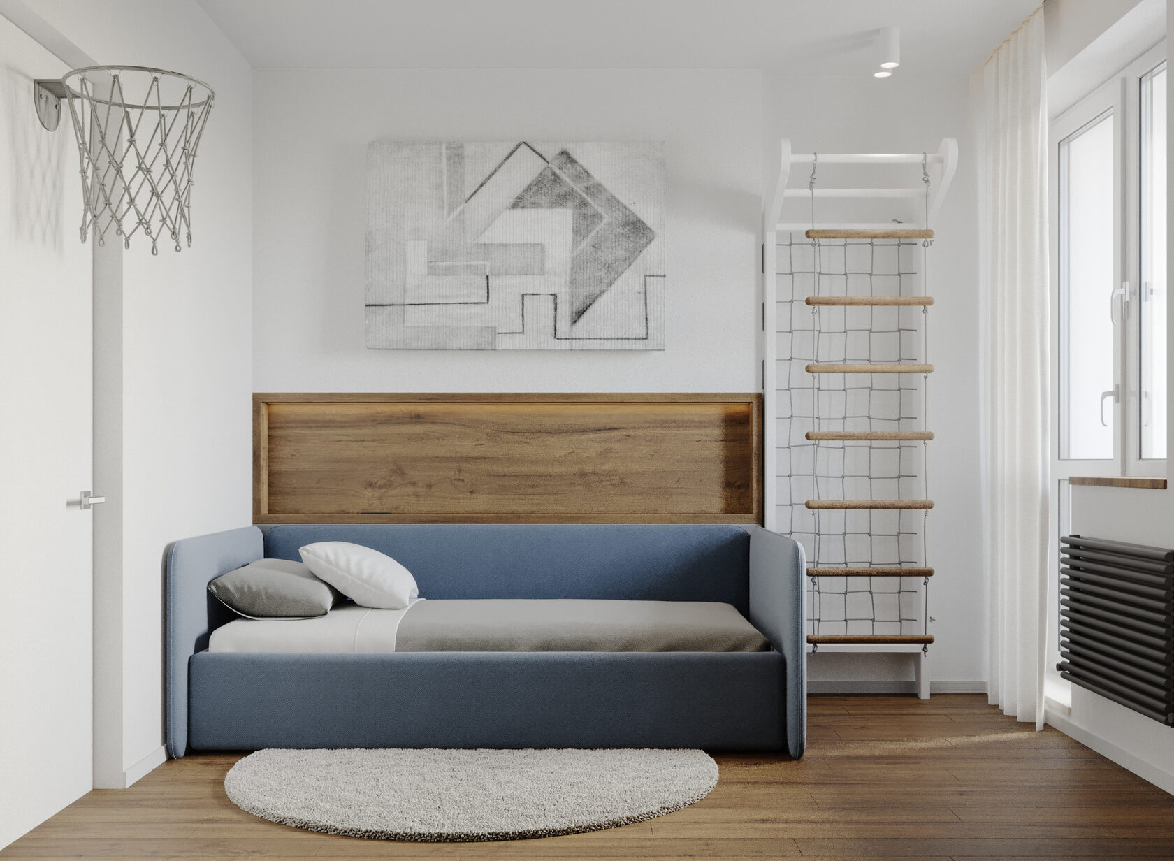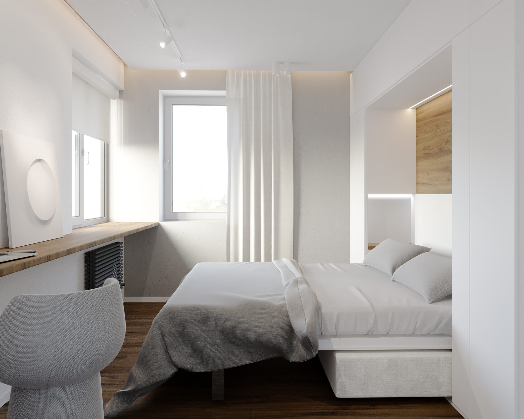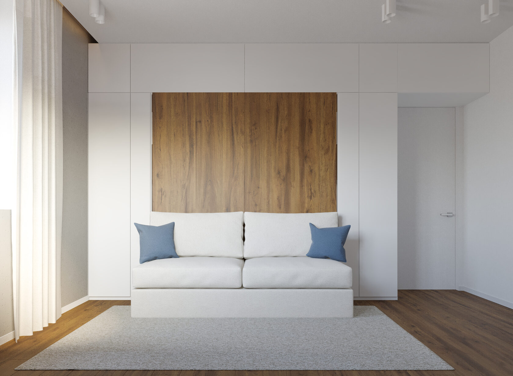 Так как квартира маленькая, и нам хотелось по максимуму использовать все пространство и сделать его функциональным, мы решили использовать в проекте мебель трансформер и поставили в спальне шкаф с кроватью-диваном. Таким образом в спальне у нас есть большой и удобный шкаф и полноценная двуспальная кровать, а когда есть необходимость кровать можно легко трансформировать в диван, и превратить спальню в просторную гостиную.