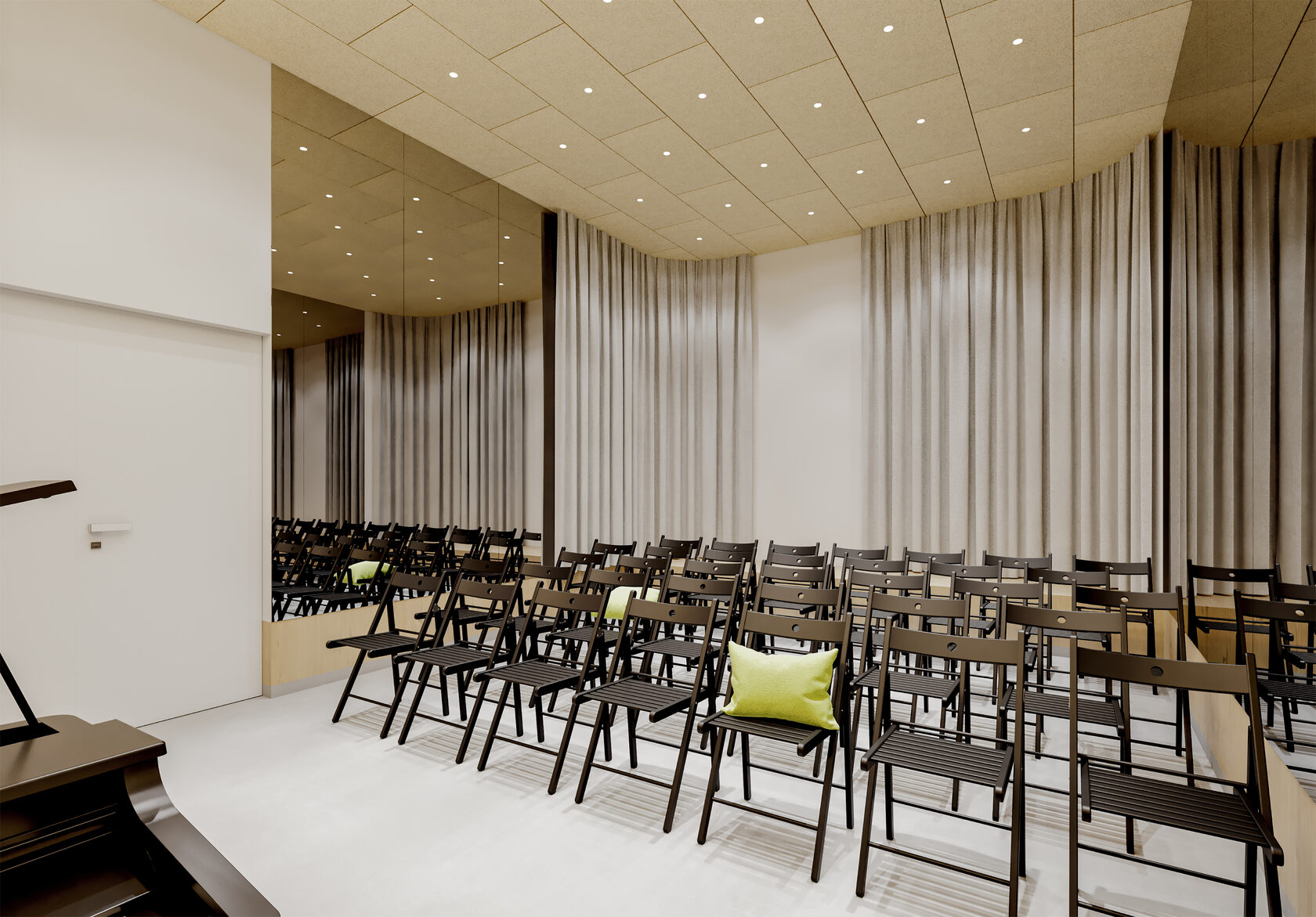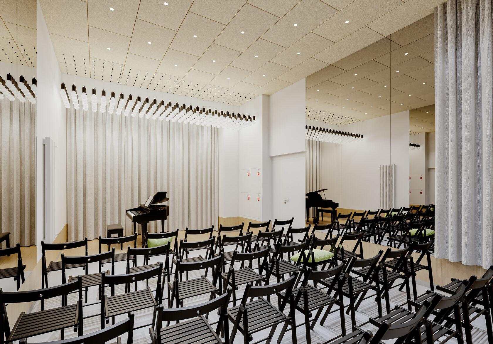 Частная музыкальная школа расположена по адресу Красногорский бульвар д.23. Задача была организовать такую среду для творчества и репетиций, в которой было бы комфортно и интересно как детям так и взрослым. У нас получилось сделать запоминающееся функциональное и вдохновляющее пространство за счет простых форм и сочетания базовых цветов и яркого акцента стен.